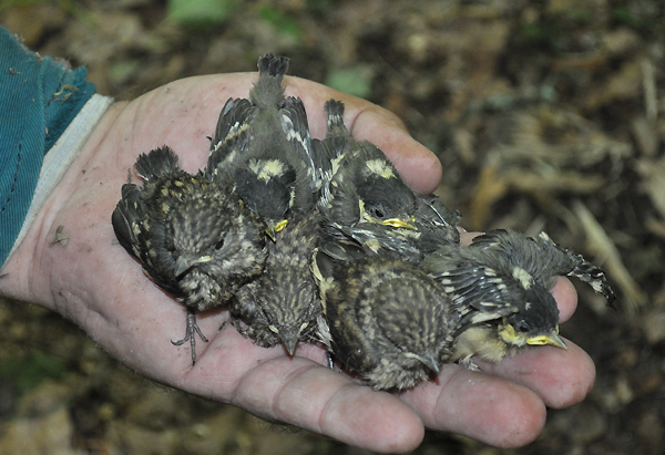 mláďata lejsků bělokrkých a 4 mladí uhelníčci. V hnízdě byla dále 3 neoplozená vejce