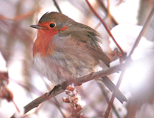 Ptáci se brání chladu načepýřením peří. Na obrázku červenka obecná.